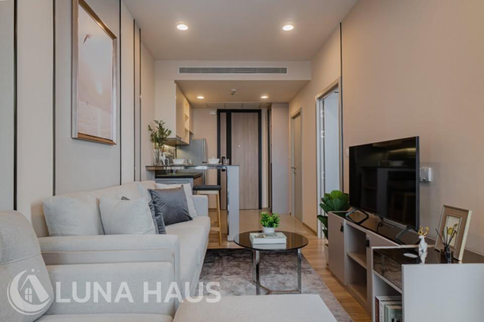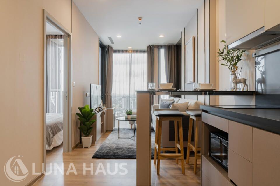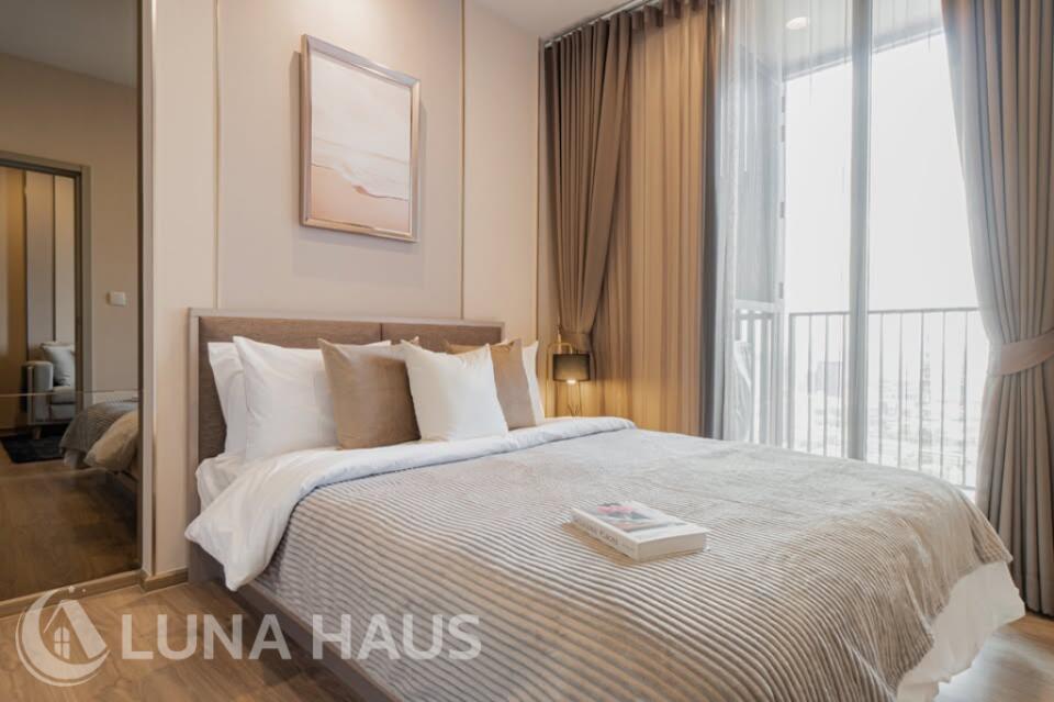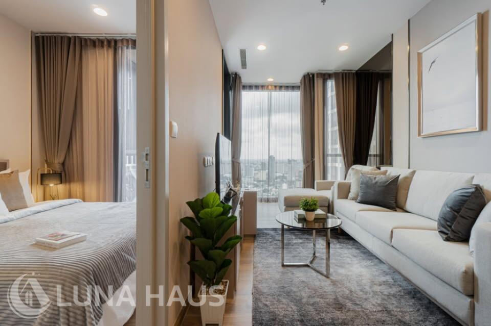 Oka House, a new resort-style condo in the center of Bangkok. Connect to various conveniences, such as Skytrain, shopping malls, markets, universities, and hospitals. This is a quality project from Sansiri that the beauty of nature is created to lobby for full relaxation. Enjoy the unlimited scenery of the Bang Krajao river curve from the rooftop as if you are sitting amid a meadow of the valley. Relax in a swimming pool with a length of 40 meters, a jacuzzi, and hydrotherapy to complete your relaxation. Be more modern with a smart design of a digital smart system to control everything at your fingertips, such as a common area reservation system, mail and parcel notification, door access via QR Code, the digital vegetable plantation system, and a trendy and smart home appliances control system via applications. These installations are to give a balance of living to everyone in the family. The room with a bay-window design has a full-height for a 180-degree view and good ventilation. Also, it is furnished with furniture from leading brands that serve all functions of living.