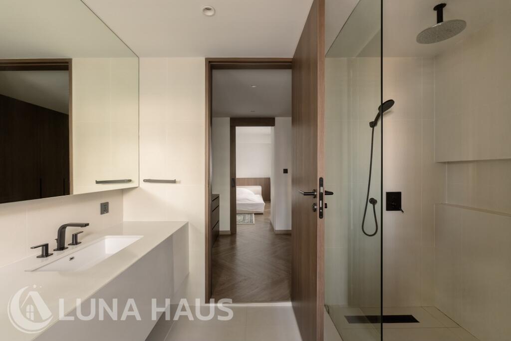 Separate powder room for guests, ensuring privacy for bedroom bathrooms